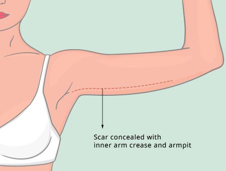 A modern incision technique used is the L-brachioplasty, described by Hurwitz, D.J., et al in the Aesthetic Surgery Journal in 2010 as an L-shaped excision stretching from the elbow to the armpit, then through the armpit and along the side of the chest: